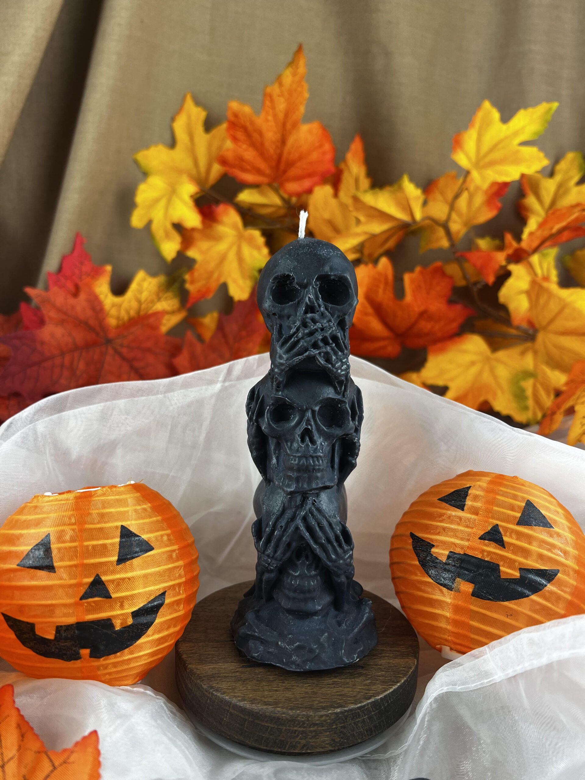Świeca wolnostojąca „Czaszki” to ręcznie wykonana świeca dekoracyjna z naturalnego wosku sojowego, stworzona z myślą o osobach poszukujących wyrazistych i nietuzinkowych dodatków do wnętrz. Co więcej, jej unikalna forma trzech czaszek ułożonych jedna na drugiej – “Nie widzę, nie słyszę, nie mówię” doskonale wpisuje się w stylistykę gothic, halloween, dark romantic oraz victorian, dzięki czemu idealnie uzupełnia aranżacje o mrocznym charakterze.